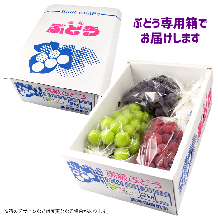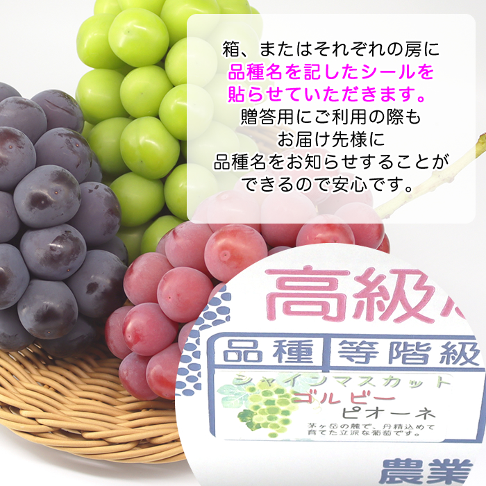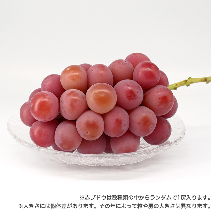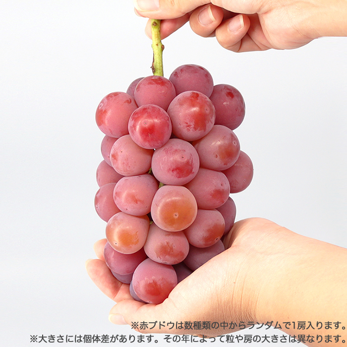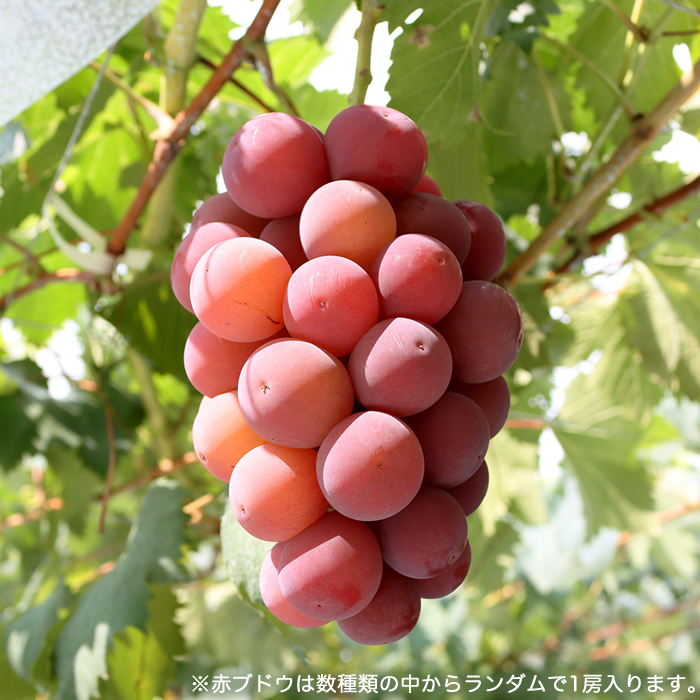 品種 | 緑:シャインマスカット 黒:ピオーネ 赤:クイーンニーナ、ゴルビー、マイハート、サニードルチェ、ウィンクの中からランダムで1房入ります。 |
