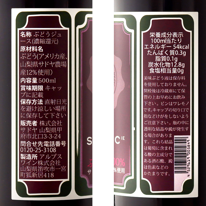 | 品種名 | マスカット・ベーリーA、サドヤ農場産(ストレート果汁)、米国産コンコード(濃縮果汁) |